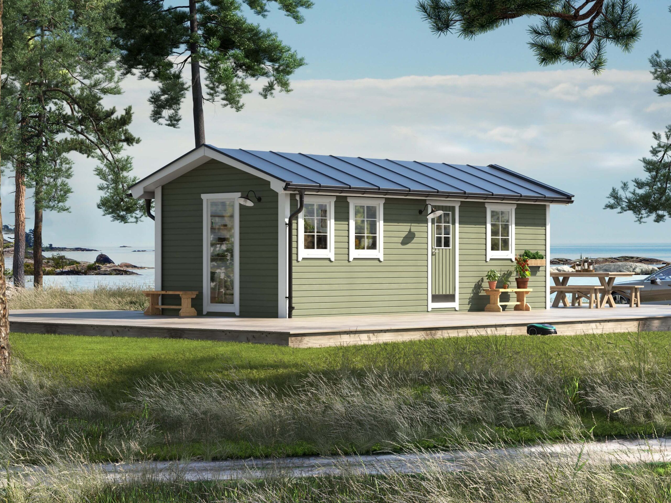Arholma 25 levereras med 1 st högerhängd dörr 8×20 dm 18° med 4×4 dm fönster med spröjs med placering på valfri långsida. 4 st 8×10 dm fönster med spröjs med placering på valfri långsida och gavel. 1 st 8×20 dm fönster fast med placering valfri gavel.