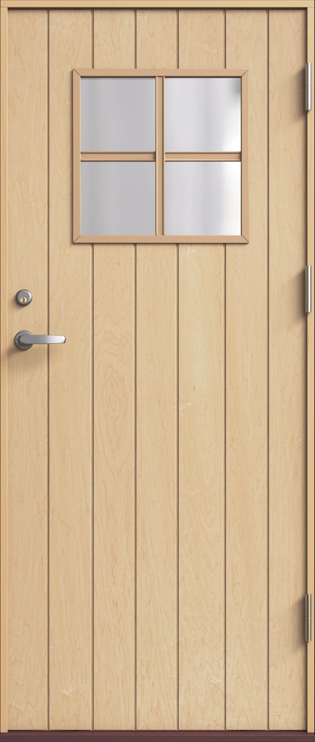 Dörr 18° 8×18,5 dm med 4×4 dm fönster med 2-glas isolerglas och löstagbart 30 mm 1.1 spröjs. Stående fräst spårprofil. Karm 45×105 mm med förborrade 14 mm hål. U-värde: uppskattat till 1,3 W/m²K. Dörr obehandlad med justerbara gångjärn i både höjd- och sidled. Högerhängd.