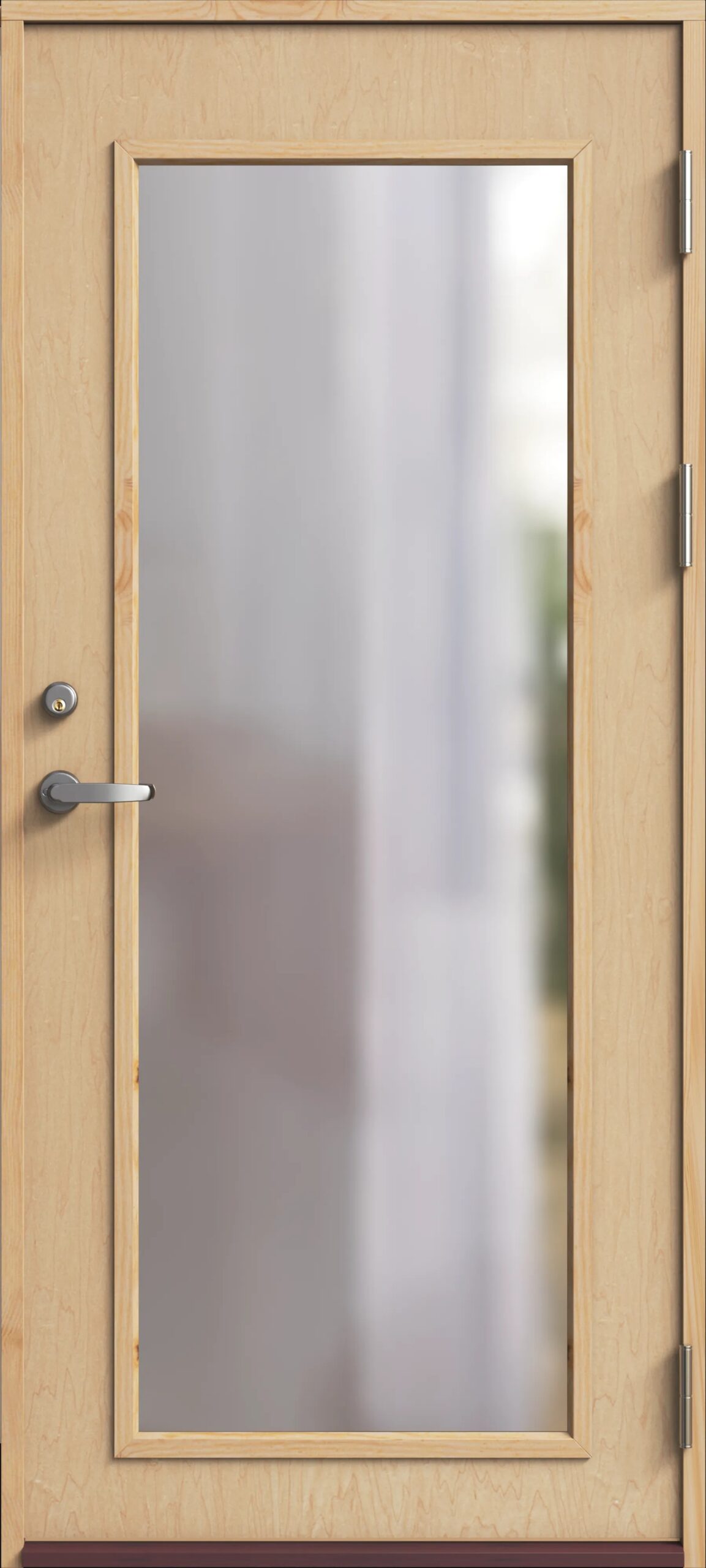 Dörr 18° 8×18,5 dm helglasad med 5,2×14,7 dm fönster med dubbelhärdat 2-glas isolerglas. Karm 45×105 mm med förborrade 14 mm hål. U-värde: uppskattat till 1,3 W/m²K. Dörr obehandlad med justerbara gångjärn i både höjd- och sidled. Högerhängd.