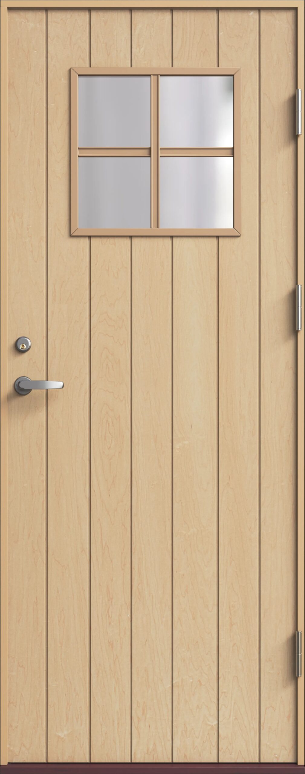 Dörr 18° 8×20 dm med 4×4 dm fönster med 2-glas isolerglas och löstagbart 30 mm 1.1 spröjs. Stående fräst spårprofil. Karm 45×105 mm med förborrade 14 mm hål. U-värde: uppskattat till 1,3 W/m²K. Dörr obehandlad med justerbara gångjärn i både höjd- och sidled. Högerhängd.