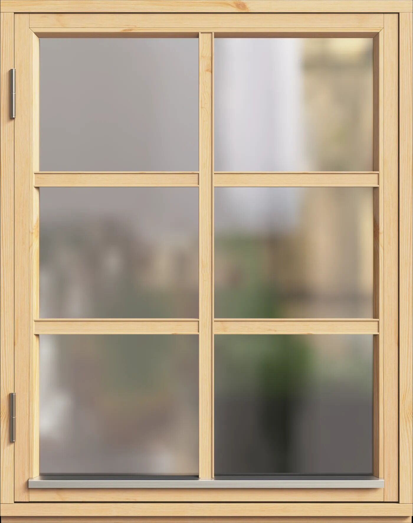 8×10 dm allmogefönster med 2-glas isolerglas och löstagbart 30 mm 1.2 spröjs. Fönstret är öppningsbart med gångjärn på karmens vänstra sida. Karm 45×103 mm med förborrade 14 mm hål. U-värde: 1,3 W/m²K. Fönster obehandlat med anodiserat droppbleck. Handtag i form av hasp och hakar samt stormbeslag.
