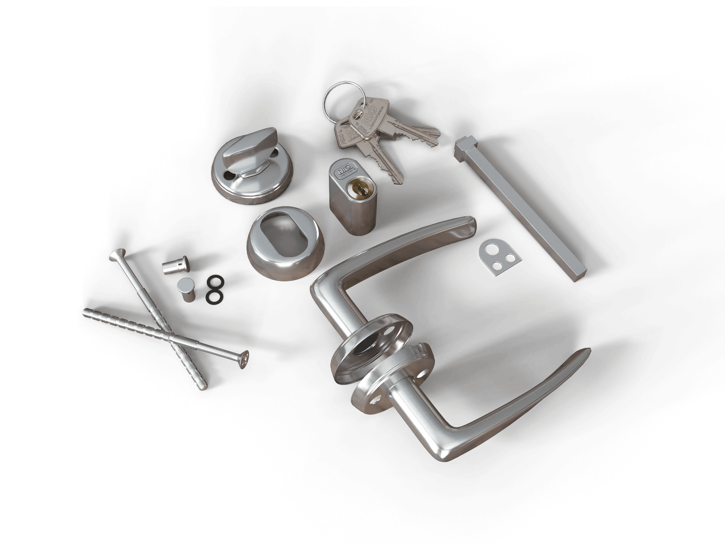 Komplett låspaket för 2 st dörr med ovalt lås, cylinderring, dörrtrycke, låsvred och handtagsskruv. Lika låsning på båda låscylindrarna.