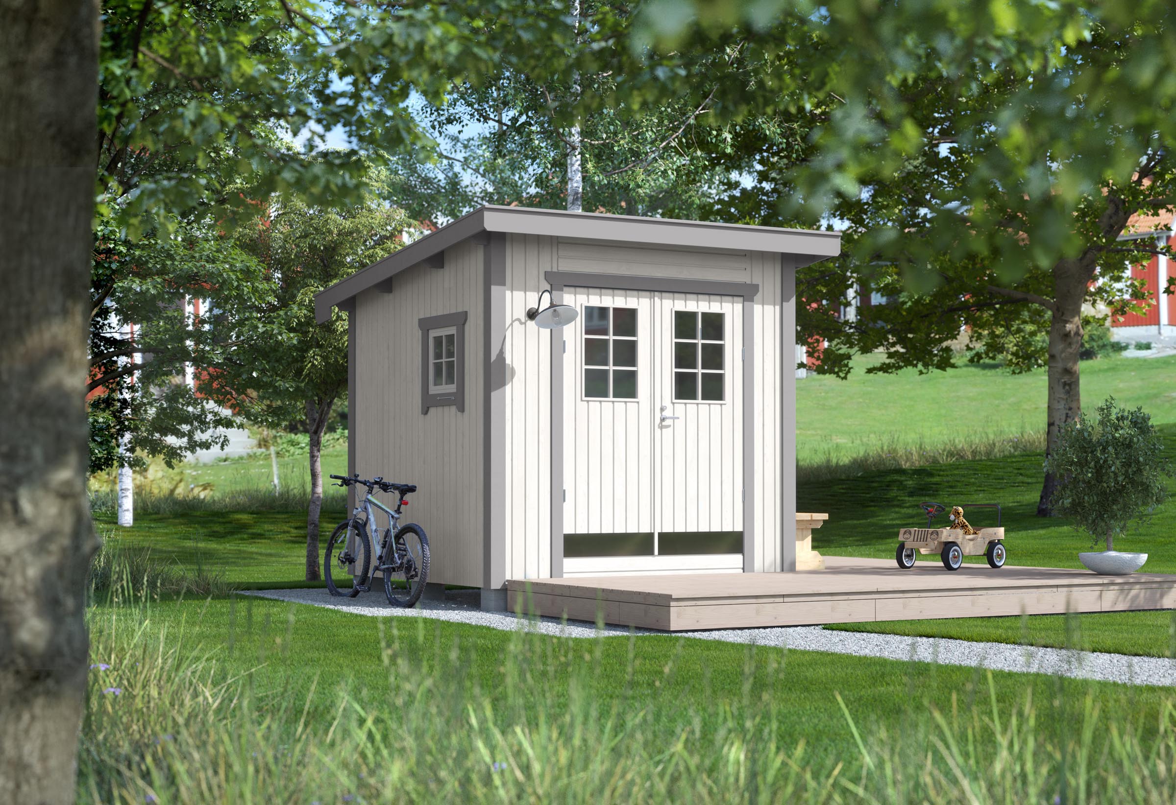 Oskar 6 är ett lite stabilt förråd på 6,5 m² med stående panel och pulpettak som passar den lilla trädgården. Oskar 6 är en 15 cm förhöjd Saga 6. Oskar 6 kan användas till förvaring av däck, gräsklippare, cyklar, trädgårdsmöbler och trädgårdsredskap. Oskar 6 fungerar även utmärkt att inreda som pumphus, bastu, snickarbod eller hobbyrum. Passar väl in i miljöer med befintliga pulpettak. Förrådet levereras som en monteringsfärdig byggsats i färdiga block med panelen monterad direkt på stommen.