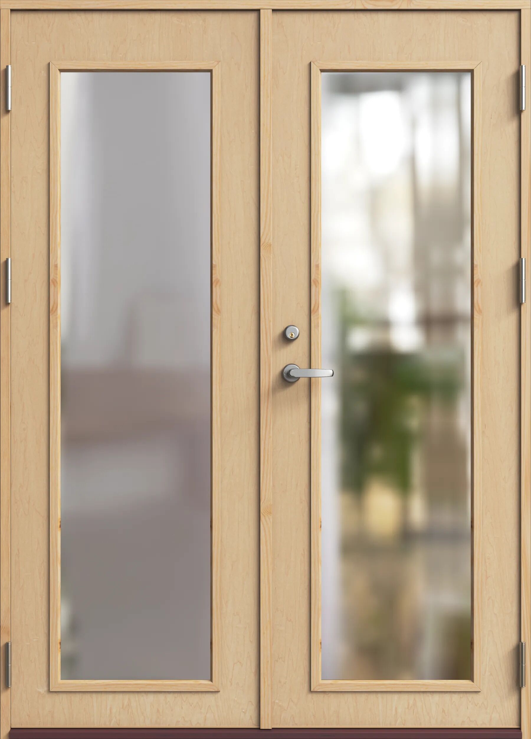 Pardörr 18° 14×20 dm helglasad med 4,2×16,8 dm fönster med dubbelhärdat 2-glas isolerglas. Karm 45×105 mm med förborrade 14 mm hål. U-värde: uppskattat till 1,3 W/m²K. Dörr obehandlad med justerbara gångjärn i både höjd- och sidled. Högerhängd.