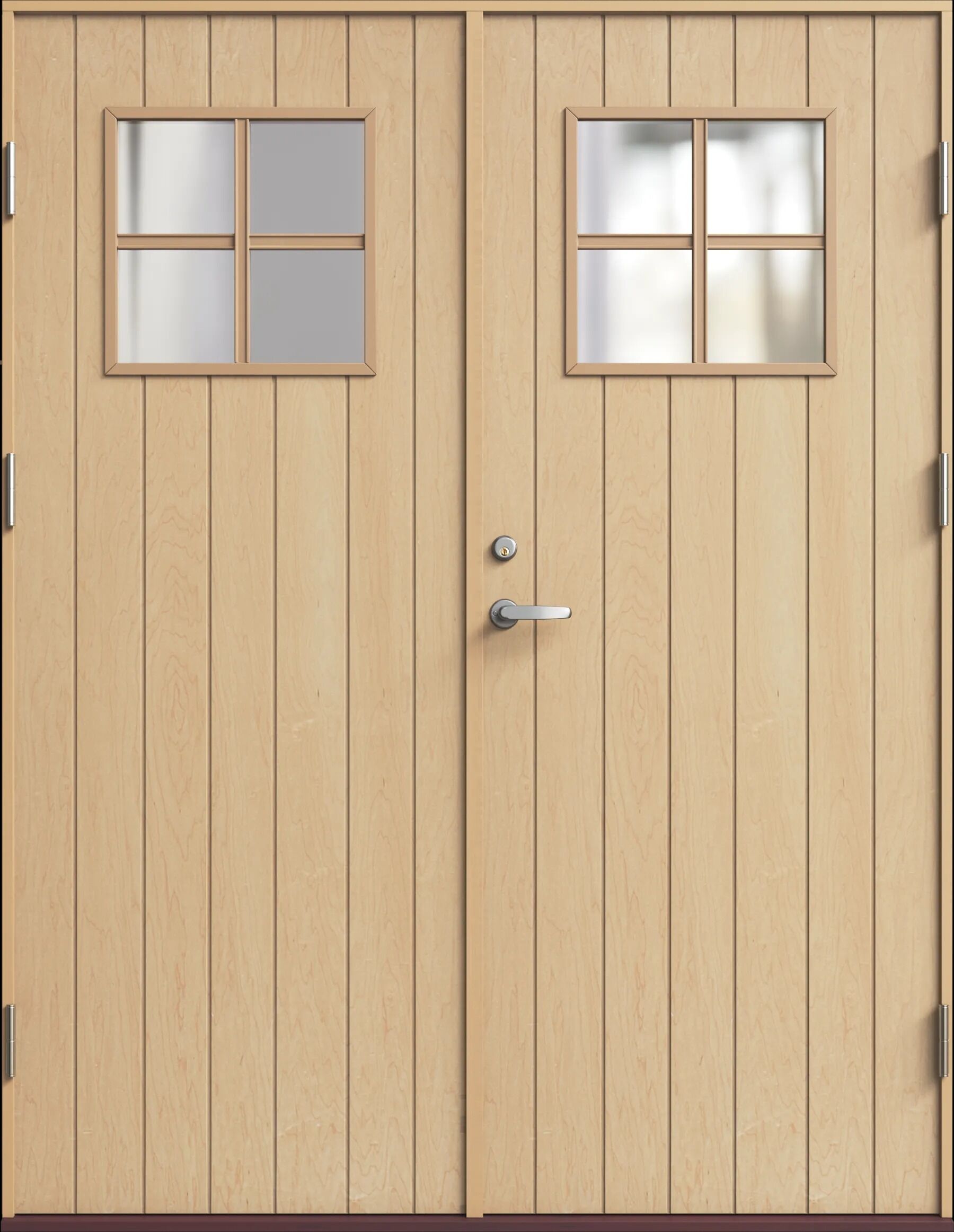Pardörr 18° 16×20 med stående frästa spår med 4×4 fönster med 2-glas isolerglas och löstagbart XX mm 1.1 spröjs. Karm 45×105 mm med förborrade 14 mm hål. U-värde: uppskattat till 1,1. Dörr obehandlad med justerabara gångjärn i både höjd- och sidled. Högerhängd.