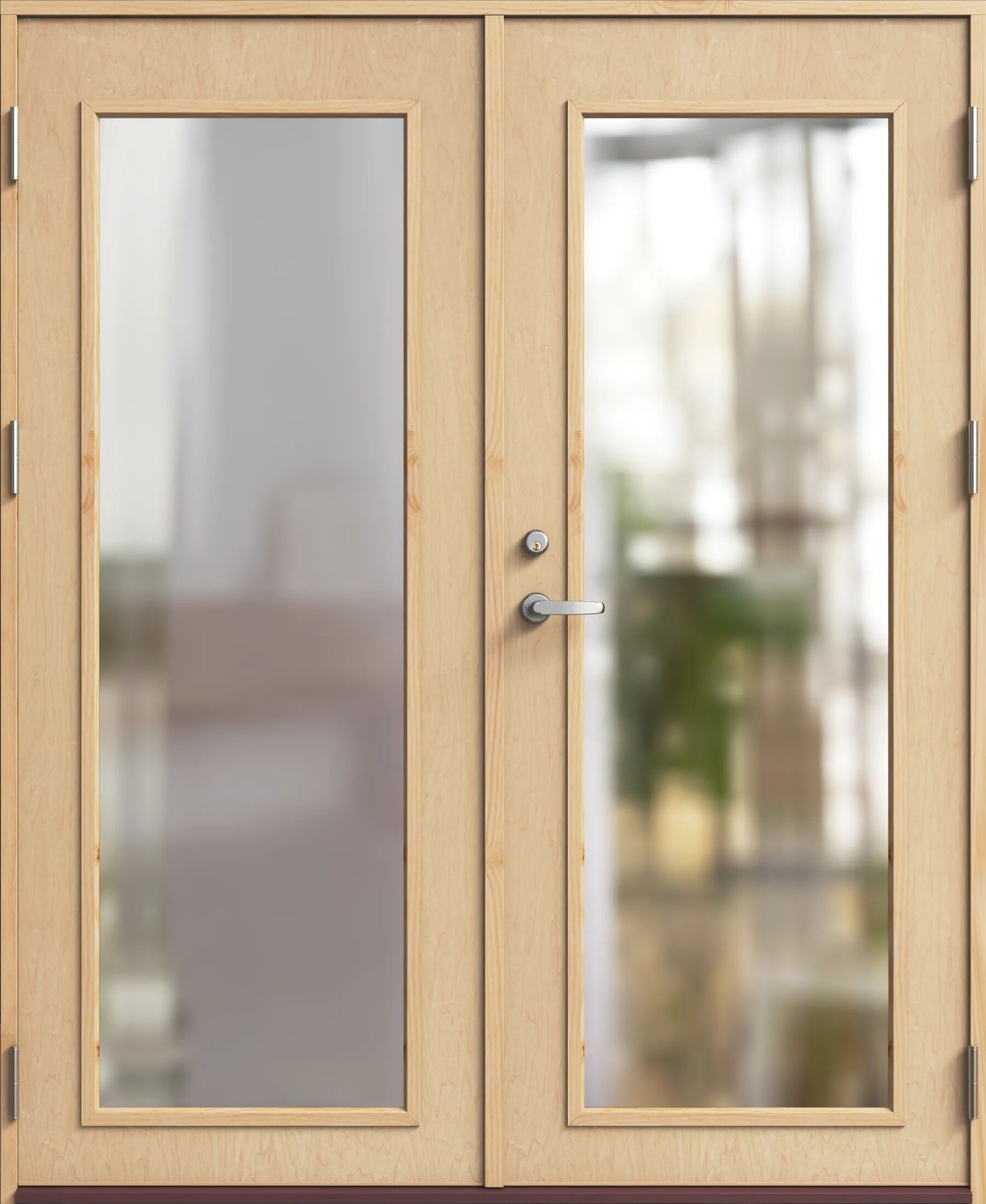 Pardörr 18° 16×20 dm helglasad med 5,2×16,8 dm fönster med dubbelhärdat 2-glas isolerglas. Karm 45×105 mm med förborrade 14 mm hål. U-värde: uppskattat till 1,3 W/m²K. Dörr obehandlad med justerbara gångjärn i både höjd- och sidled. Högerhängd.