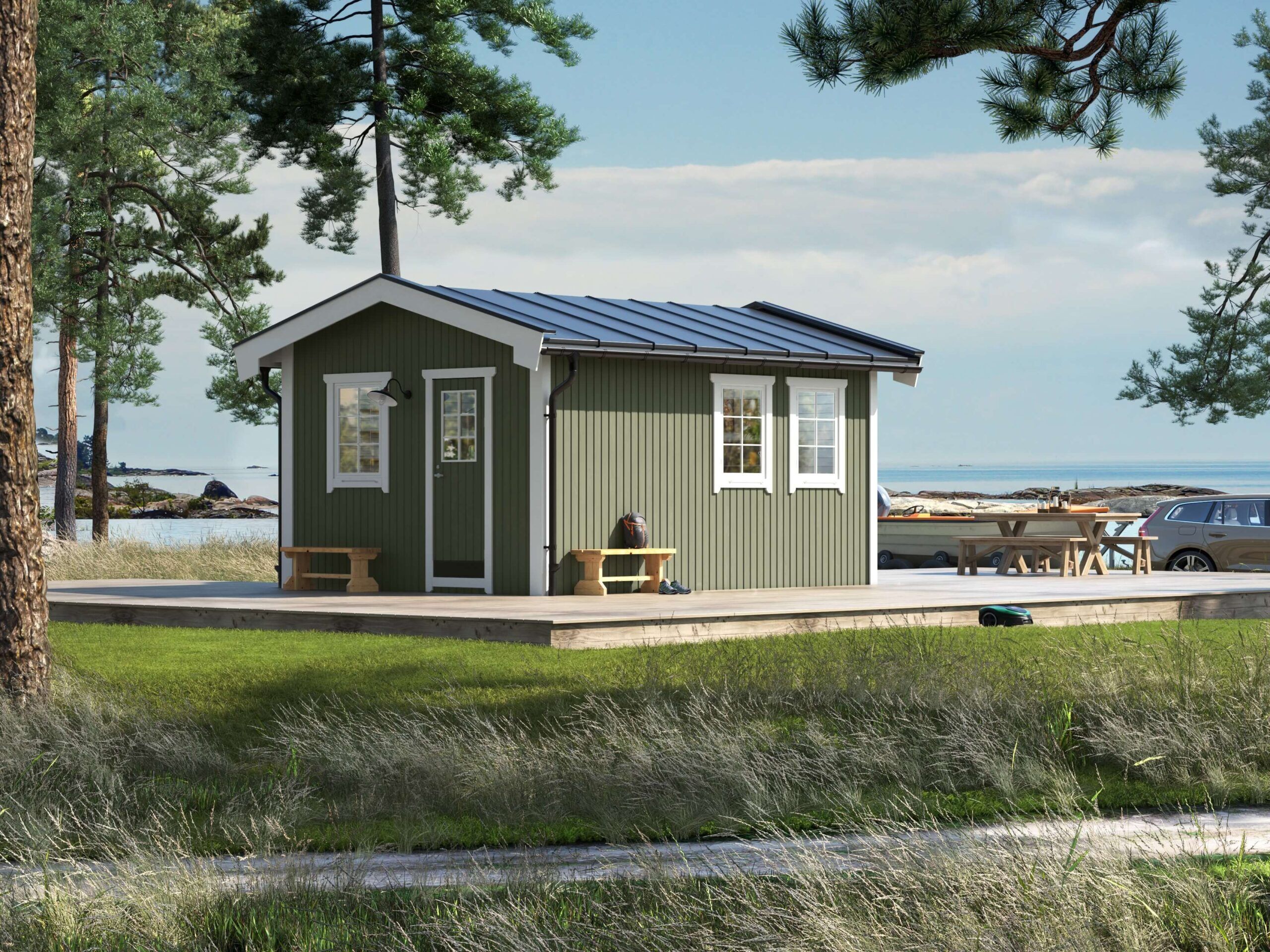 Paulina 20 är ett robust mindre Attefallshus på 19,9 m² med stående panel och sadeltak. Paulina 20 är lämplig som gäststuga till sommarstugan eller som komplement till befintligt bostadshus. Paulina 20 är ett bra val där stort gaveldjup önskas. Passar väl in i miljöer med befintliga sadeltak. Attefallshuset levereras som en monteringsfärdig byggsats där stommen kommer i färdiga block med självbärande takstolar. Panelen levereras lös i färdiga längder för montage med vindskydd och spikläkt på stommen.