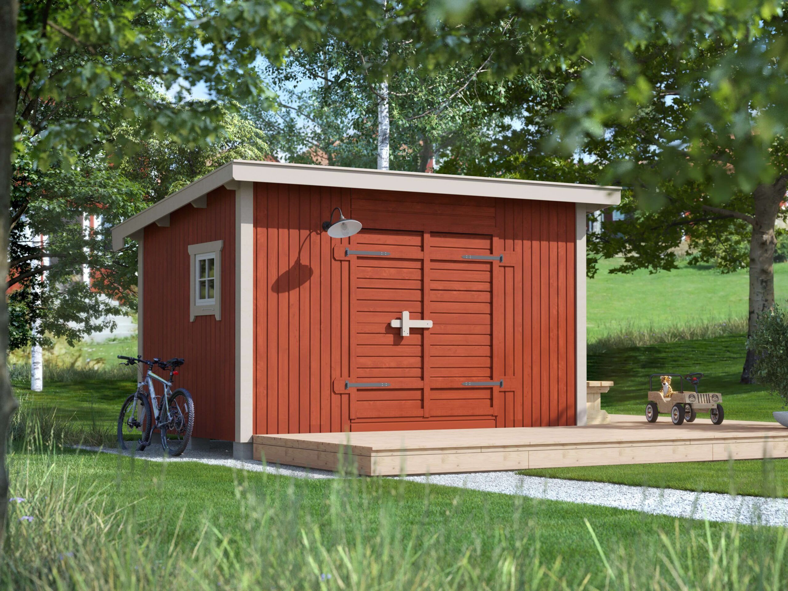 Saga 10 är ett lite större stabilt förråd på 9,6 m² med stående panel och pulpettak som passar den lite större trädgården. Saga 10 kan användas till förvaring av däck, gräsklippare, cyklar, trädgårdsmöbler och trädgårdsredskap. Saga 10 fungerar även utmärkt att inreda som pumphus, bastu med relax, snickarbod eller hobbyrum. Passar väl in i miljöer med befintliga pulpettak. Förrådet levereras som en monteringsfärdig byggsats i färdiga block med panelen monterad direkt på stommen.