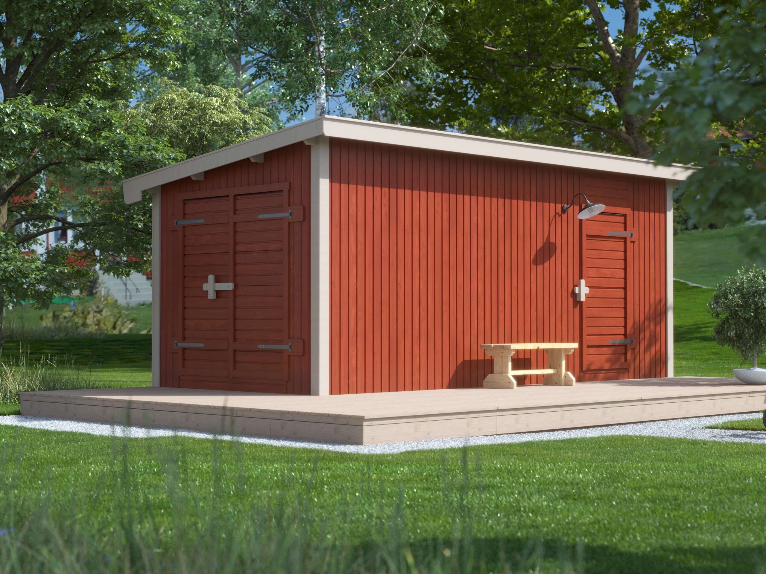 Saga 15 är ett större stabilt förråd på 14,5 m² med stående panel och pulpettak som passar den större trädgården. Saga 15 kan användas till förvaring av däck, gräsklippare, cyklar, trädgårdsmöbler och trädgårdsredskap. Förrådet är bestyckat med 2 dörrar vilket ger möjlighet att skräddarsy utrymmena efter behov. Saga 15 fungerar även utmärkt att inreda som bastu med relax, snickarbod eller hobbyrum. Passar väl in i miljöer med befintliga pulpettak. Förrådet levereras som en monteringsfärdig byggsats i färdiga block med panelen monterad direkt på stommen.