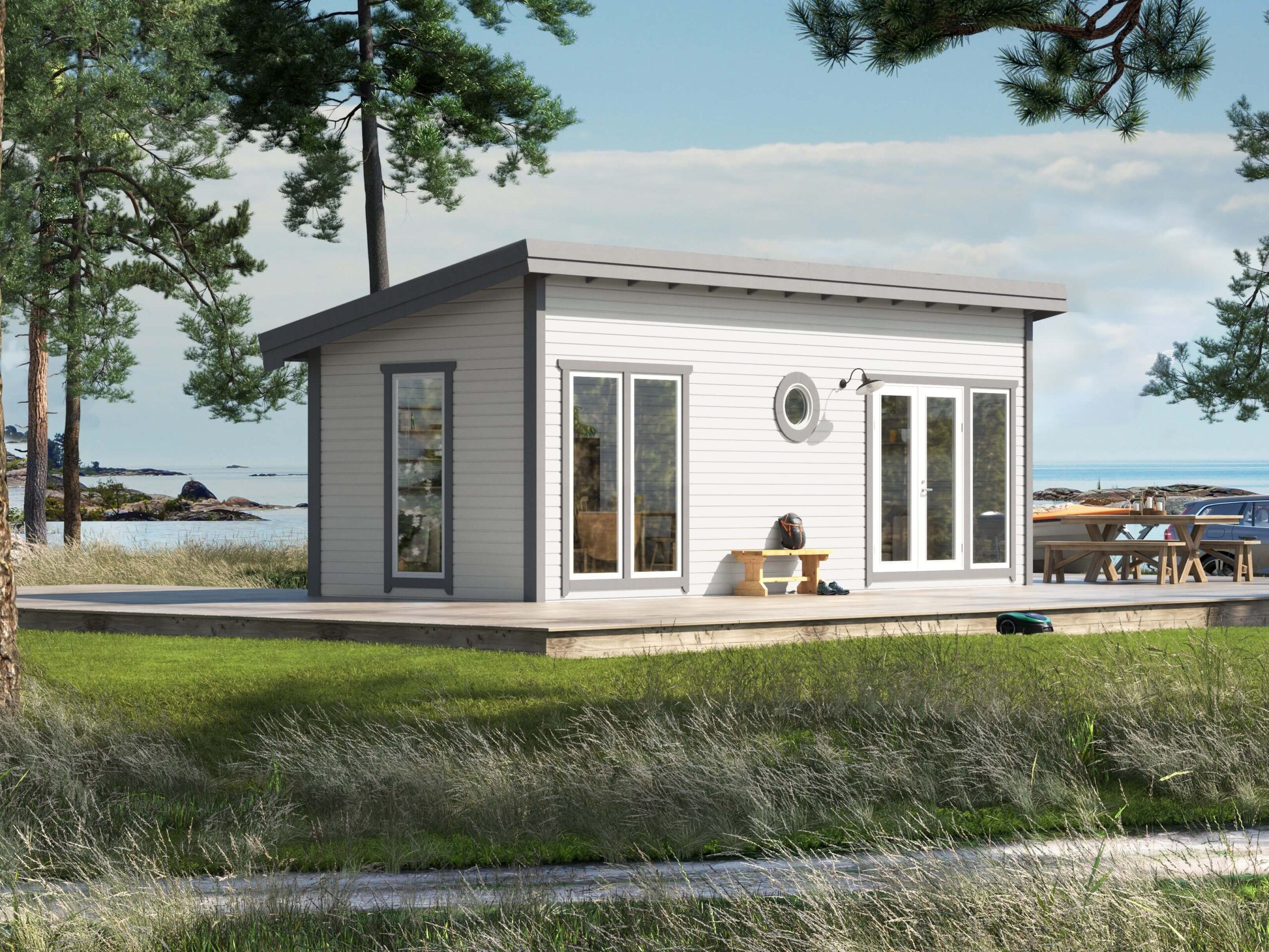 Skagen 25 är ett robust mellanstort Attefallshus på 24,8 m² med liggande panel och pulpettak. Skagen 25 är lämplig som gäststuga till sommarstugan eller som komplement till befintligt bostadshus. Skagen 25 är ett bra val där en långsmal byggnad passar. Skagen 25 har ett stort ljusinsläpp och passar väl in i miljöer med befintliga pulpettak och byggnader med liggande panel. Attefallshuset levereras som en monteringsfärdig byggsats där stommen kommer i färdiga block med självbärande takbjälkar. Panelen levereras lös för montage med vindskydd och spikläkt på stommen.