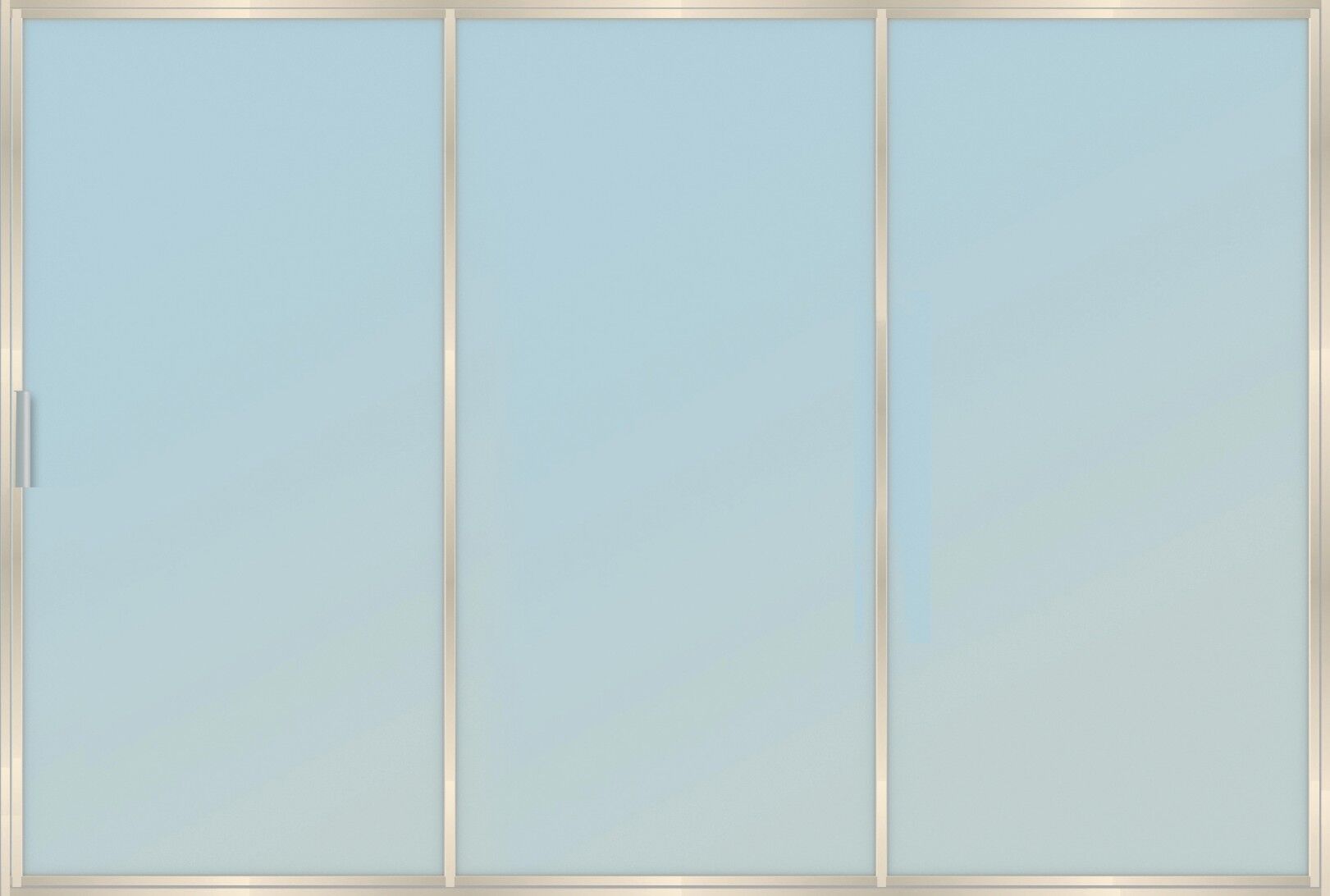 3 dörrars skjutparti 29,5×20 dm aluminium med 2-glas isolerglas. Karm 35×125 mm. U-värde: uppskattat till 2,5 W/m²K. Snäpplås till in och utsida.